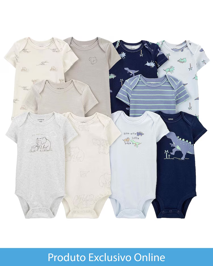 Conforto e economia para o seu bebê. O Enxoval bebê 10 peças dinossauros e elefantes multicor | Carter's será a sua escolha certa. O enxoval vem com 10 bodies de manga curta, ombros traspassados, facilitando o uso e troca do bebê e estampas variadas de dinossauros, listrada e elefante. Aproveite!